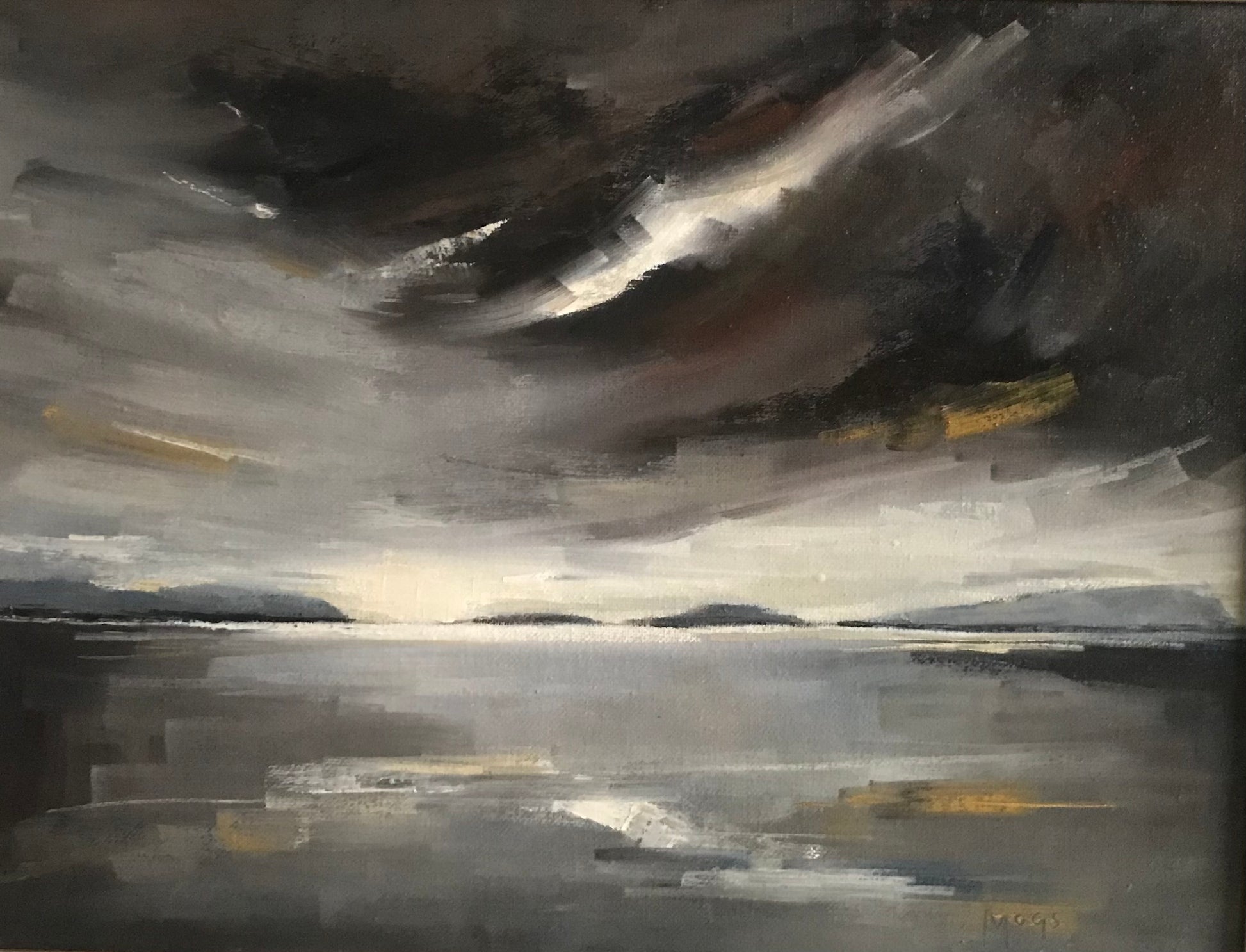 Looking out to the islands on a dark evening with a threatening sky. The light dramatically cuts through the clouds, creating an illuminating effect over the sea